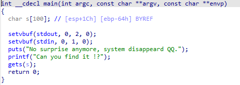 这题在 ret2libc1 的基础上去掉了binsh字符串。也就是说,我们需要自己构建一个gets输入/bin/sh并作为system的参数引用。